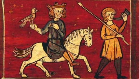 Imatge: Jaume I practicant la caça amb falcons, de l'enteixinat del Palau Conques de Montpeller, decorat vers 1260/1262 arran de les festes matrimonials de Pere el Gran i Constança de Sicília (Musée Languedocien, Montpeller).