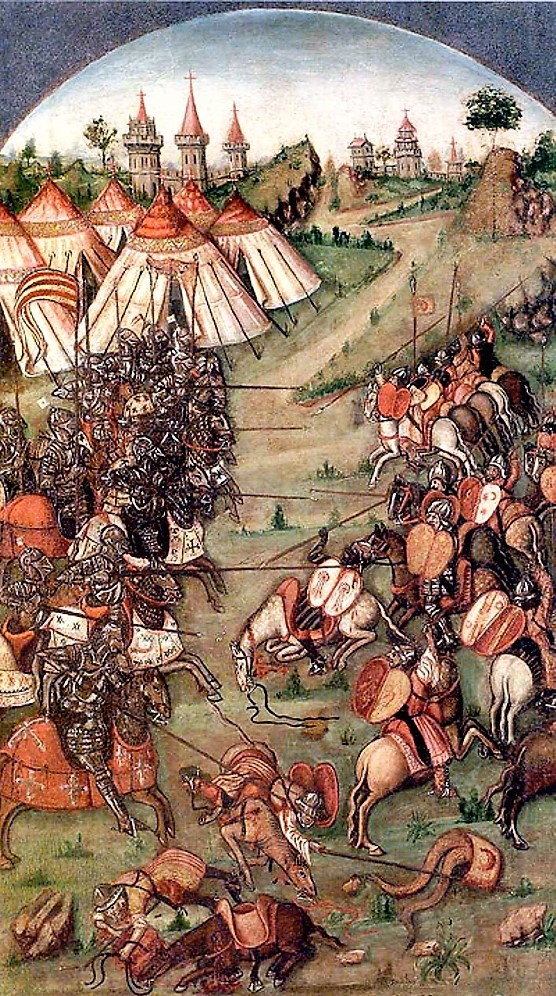 9. Combat entre forces de cavalleria. Batalla de Llutxent. Retaule dels Corporals de Daroca. Daroca, Museo de la Colegial de Daroca (s. XV).