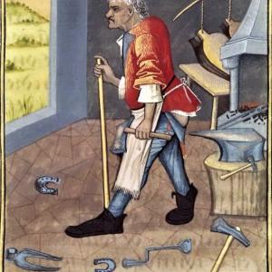 1. Ferrer al seu obrador, amb la indumentària típica i voltat de tot l'instrumental. Representació de Vulcà, a Évrard de Conty, Échecs amoureux. París, Bibliothèque nationale de France, ms. Fr. 143, f. 148r (c. 1496-1498).
